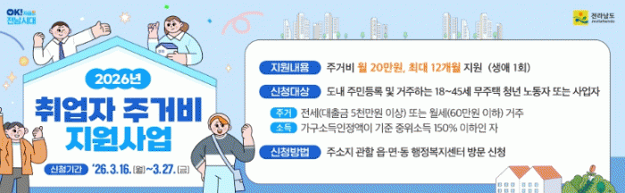 [¹Ìµð¾îÀü³² Á¦°¥´ëÁ¾ ±âÀÚ] Àü¶ó³²µµ°¡ û³âÀÇ Áְźñ ºÎ´ã ¿ÏÈ¿Í Áö¿ª Á¤Âø Áö¿øÀ» À§ÇØ ¡®Ã»³â Ãë¾÷ÀÚ Áְźñ Áö¿ø»ç¾÷¡¯ ´ë»óÀÚ 400¸íÀ» ¸ðÁýÇÑ´Ù. ÀÌ »ç¾÷Àº »çȸ¿¡ ù¹ßÀ» ³»µó´Â û³âÀÇ ÁÖ°Å ¾ÈÁ¤°ú °æÁ¦Àû ÀÚ¸³À» Áö¿øÇϱâ À§ÇØ¡¦