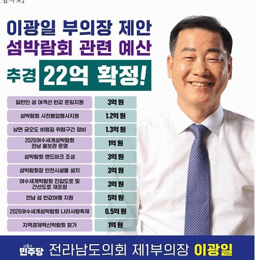 [¹Ìµð¾îÀü³² Á¦°¥´ëÁ¾ ±âÀÚ] Àü¶ó³²µµÀÇȸ À̱¤ÀÏ Á¦1ºÎÀÇÀåÀº 12ÀÏ ¿¸° Àü¶ó³²µµÀÇȸ º»È¸ÀÇ¿¡¼ 2026¿©¼ö¼¼°è¼¶¹Ú¶÷ȸ °ü·Ã Ãß°¡°æÁ¤¿¹»ê 22¾ï ¿øÀÌ ÃÖÁ¾ È®Á¤µÆ´Ù°í ¹àÇû´Ù. À̹ø Ãß°æ ¿¹»êÀº ¿©¼ö¼¼°è¼¶¹Ú¶÷ȸÀÇ ¼º°øÀûÀÎ °³ÃÖ¸¦¡¦