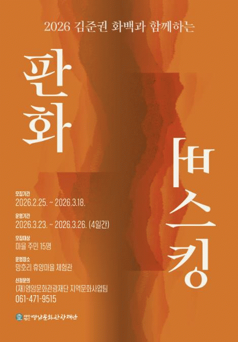 [¹Ìµð¾îÀü³² °í±Ô¼® ±âÀÚ](Àç)¿µ¾Ï¹®È°ü±¤Àç´ÜÀº ¿À´Â 3¿ù 23ÀϺÎÅÍ 26ÀÏ 4Àϰ£, ¸¶À»ÁֹΠ´ë»óÀ¸·Î ÇÑ ¡®2026 ±èÁØ±Ç È¹é°ú ÇÔ²²ÇÏ´Â ÆÇȹö½ºÅ·¡¯ÇÁ·Î±×·¥ Âü¿©ÀÚ¸¦ ¸ðÁýÇÑ´Ù. ¸ÁÈ£¸® È޾縶À» üÇè°ü¿¡¼ ÁøÇàÇÏ´Â ÇÁ·Î±×·¥Àº ÁֹΡ¦