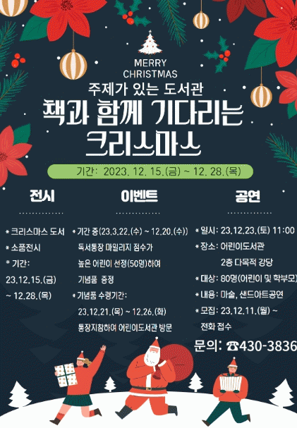 [¹Ìµð¾îÀü³² °í±Ô¼® ±âÀÚ]°Áø±ºµµ¼°üÀÌ 12¿ù 15ÀϺÎÅÍ 28ÀϱîÁö ¡®Ã¥°ú ÇÔ²² ±â´Ù¸®´Â Å©¸®½º¸¶½º¡¯¸¦ ÁÖÁ¦·Î ¡ãÅ©¸®½º¸¶½º¿Í °ü·ÃµÈ µµ¼, ¼Òǰ Àü½Ã ¡ãµ¶¼ÅëÀå ¸¶Àϸ®Áö À̺¥Æ® ¡ã¸¶¼ú, »÷µå¾ÆÆ® °ø¿¬ µîÀ» ¼±º¸ÀδÙ. µµ¼°ü¿¡¼´Â¡¦