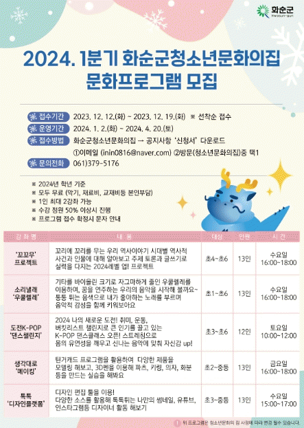 [¹Ìµð¾îÀü³² Á¦°¥´ëÁ¾ ±âÀÚ]ȼø±º û¼Ò³â¹®ÈÀÇÁýÀÌ 2024³â 1ºÐ±â ¹®ÈÇÁ·Î±×·¥ Âü°¡ û¼Ò³â 64¸íÀ» ¼±Âø¼ø ¸ðÁýÇÑ´Ù. û¼Ò³â¹®ÈÀÇÁýÀ» ÀÌ¿ëÇϴ û¼Ò³â°ú ¿î¿µÀ§¿øÈ¸ÀÇ ÀǰßÀ» ¹Ý¿µÇØ ¡ã¼Ò¸®³¾·¡ ¡®¿ìÄð·¼·¹¡¯ ¡ã¡®²¿²¿¹«¡¯ ÇÁ·ÎÁ§Æ®¡¦