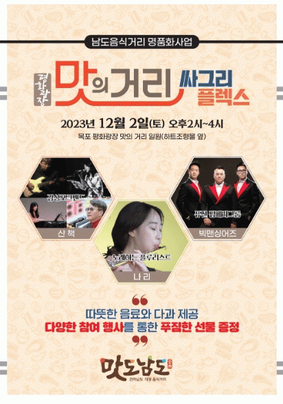 [¹Ìµð¾îÀü³² °í±Ô¼® ±âÀÚ]¸ñÆ÷½Ã°¡ ¿À´Â 12¿ù 2ÀÏ ³²µµÀ½½Ä°Å¸® ¸íÇ°È »ç¾÷ Ȱ¼ºÈ¸¦ À§ÇØ Æòȱ¤Àå ÀÏ¿ø¿¡¼ ¸ÀÀÇ °Å¸® È«º¸ Çà»ç¸¦ °³ÃÖÇÑ´Ù. À̹ø Çà»ç´Â '½Î±×¸® Ç÷º½º'¸¦ ÁÖÁ¦·Î Æòȱ¤Àå ¸ÀÀÇ °Å¸® ÀÏ¿øÀ» µ¹¸ç ½Ã¹Î¡¤ °ü±¤°´ ¡¦