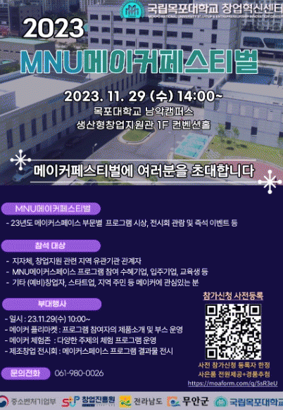 [¹Ìµð¾îÀü³² ±èÆÇ±¹ ±âÀÚ]Àü³² ¹«¾È±ºÀº ±¹¸³¸ñÆ÷´ëÇб³ â¾÷Çõ½Å¼¾ÅÍ(¼¾ÅÍÀå À¯¿µÀç)¿¡¼ ¿î¿µÇÏ´Â MNU¸ÞÀÌÄ¿½ºÆäÀ̽º¿¡¼ ¿À´Â 11¿ù 29ÀÏ ¡®2023 MNU¸ÞÀÌÄ¿Æä½ºÆ¼¹ú¡¯À» °³ÃÖÇÑ´Ù°í ¹àÇû´Ù. ¡®2023 MNU¸ÞÀÌÄ¿Æä½ºÆ¼¹ú¡¯Àº Áö¿ªÀÇ À¯¸Á¡¦