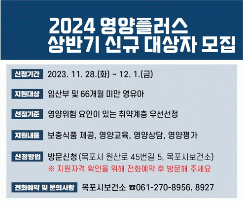 [¹Ìµð¾îÀü³² °í±Ô¼® ±âÀÚ]¸ñÆ÷½Ãº¸°Ç¼Ò°¡ ¿À´Â 28ÀϺÎÅÍ 12¿ù 1ÀϱîÁö 4Àϰ£ ¡®2024³â ¿µ¾çÇ÷¯½º»ç¾÷¡¯ »ó¹Ý±â ½Å±Ô ´ë»óÀÚ¸¦ ¸ðÁýÇÑ´Ù. ¡®¿µ¾çÇ÷¯½º »ç¾÷¡¯Àº ÀÓ»êºÎ ¹× ¿µÀ¯¾ÆÀÇ ¿µ¾ç¹®Á¦¸¦ ÇØ¼ÒÇÏ°í ½º½º·Î ½Ä»ýȰÀ» °ü¸®ÇÒ ¼ö Àִ¡¦