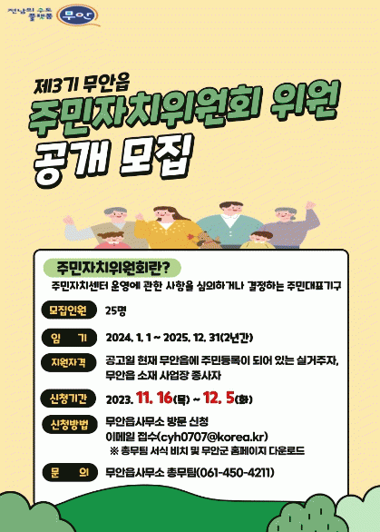 [¹Ìµð¾îÀü³² ±èÆÇ±¹ ±âÀÚ]¹«¾È±º ¹«¾ÈÀ¾Àº Á¦2±â ¹«¾ÈÀ¾ÁÖ¹ÎÀÚÄ¡À§¿ø ÀӱⰡ ¿À´Â 12¿ù ¸¸·áµÊ¿¡ µû¶ó Á¦3±â ¹«¾ÈÀ¾ÁÖ¹ÎÀÚÄ¡À§¿øÀ» °ø°³ ¸ðÁýÇÑ´Ù. Á¦3±â ÁÖ¹ÎÀÚÄ¡À§¿ø ¸ðÁýÀοøÀº 25¸í À̳»À̸ç, ½ÅûÀÚ°ÝÀº °ø°íÀÏ ÇöÀç ¹«¾ÈÀ¾ ³»¿¡ ÁÖ¡¦