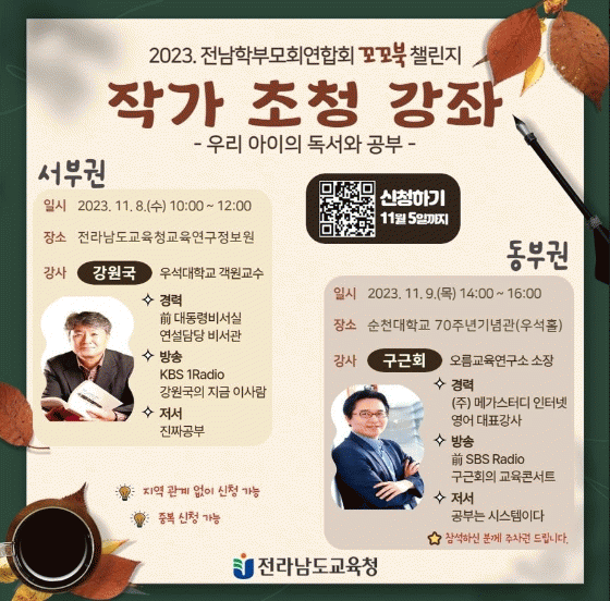 [¹Ìµð¾îÀü³² °í±Ô¼® ±âÀÚ]Àü¶ó³²µµ±³À°Ã»Àº Àü³²Çкθðȸ¿¬ÇÕȸ¿Í ÇÔ²² 2023³â Àü³²Çкθðȸ¿¬ÇÕȸ Ư»ö»ç¾÷ÀÎ ¡®²¿²¿ºÏ(²¿¸®¿¡ ²¿¸®¸¦ ¹«´Â BOOK) 縰Áö¡¯¿Í ¿¬°èÇÑ ÀÛ°¡ ÃÊû Çкθð °Á¸¦ 11¿ù 8ÀÏ(¼ö)°ú 9ÀÏ ¸ñ¿äÀÏ ±Ç¿ª º°·Î °³ÃÖ¡¦