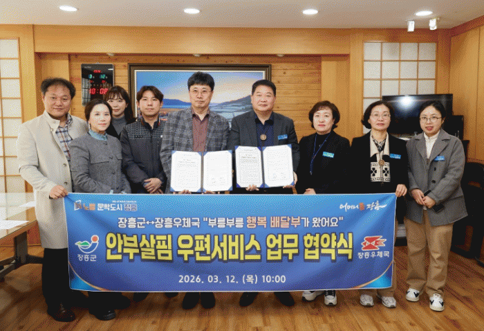 [¹Ìµð¾îÀü³² Á¦°¥´ëÁ¾ ±âÀÚ]ÀåÈﱺÀº 12ÀÏ ÀåÈï¿ìü±¹°ú Ãë¾à°èÃþÀÇ ¾ÈºÎ È®Àΰú º¹Áö »ç°¢Áö´ë ÇØ¼Ò¸¦ À§ÇÑ ¡®¾ÈºÎ»ìÇË ¿ìÆí¼ºñ½º »ç¾÷¡¯ ¾÷¹«Çù¾àÀ» ü°áÇß´Ù°í ¹àÇû´Ù. À̹ø »ç¾÷Àº ÇàÁ¤¾ÈÀüºÎ°¡ ÁÖ°üÇÏ´Â ¡®2026³â À¾¸éµ¿ ½º¸¶Æ® º¹¡¦