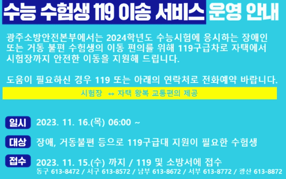 [¹Ìµð¾îÀü³² Á¦°¥´ëÁ¾ ±âÀÚ]±¤ÁÖ±¤¿ª½Ã¼Ò¹æ¾ÈÀüº»ºÎ´Â ¿À´Â 16ÀÏ ½Ç½ÃÇÏ´Â 2024Çг⵵ ´ëÇмöÇдɷ½ÃÇè ¼öÇè»ý ÆíÀǸ¦ Áö¿øÇϱâ À§ÇØ ¡®119ÀÌ¼Û ¼ºñ½º¡¯¸¦ Á¦°øÇÑ´Ù. 119ÀÌ¼Û ¼ºñ½º´Â Àå¾Ö³ª »ç°íºÎ»ó µîÀ¸·Î °Åµ¿ÀÌ ºÒÆíÇÑ ¼öÇè»ýÀ»¡¦