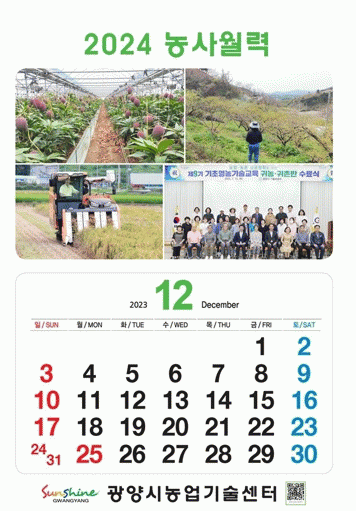 [¹Ìµð¾îÀü³² ÀÓ¼º¿Ï ±âÀÚ]±¤¾ç½Ã´Â ³ó¾÷ÀεéÀÇ Àû±â ¿µ³óÃßÁøÀ» À§ÇØ 2024³âµµ ³ó»ç¿ù·Â 2,900ºÎ¸¦ Á¦ÀÛÇØ ¿À´Â 11¿ù 1ÀϺÎÅÍ À¾¸éµ¿ ³ó¾÷Àλó´ã¼Ò¿¡¼ ¹èºÎÇÑ´Ù°í ¹àÇû´Ù. ³ó»ç¿ù·Â¿¡´Â ¿ùº°·Î ½Ä·®ÀÛ¹°, ¿ø¿¹ÀÛ¹°, Ãà»ê ¿µ³óÁ¤º¸°¡ ½Ç¡¦