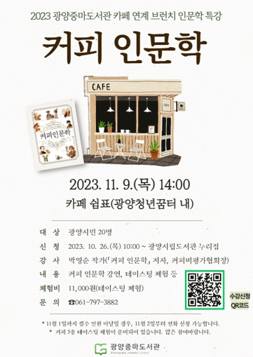 [¹Ìµð¾îÀü³² ÀÓ¼º¿Ï ±âÀÚ]±¤¾çÁ߸¶µµ¼°üÀº ¿À´Â 11¿ù 9ÀÏ ¿ÀÈÄ 2½Ã ±¤¾çû³â²ÞÅÍ ³» Ä«Æä ½°Ç¥¿¡¼ 'Ä¿ÇÇ Àι®ÇÐ'ÀÇ ÀúÀÚÀÎ ¹Ú¿µ¼ø ÀÛ°¡¸¦ ÃÊÃ»ÇØ 'Ä«Æä ¿¬°è ºê·±Ä¡ Àι®ÇРƯ°'À» ¿î¿µÇÑ´Ù. ¹Ú¿µ¼ø ÀÛ°¡´Â Ä¿ÇǺñÆò°¡Çùȸ(CCA)ÀÇ È¸¡¦