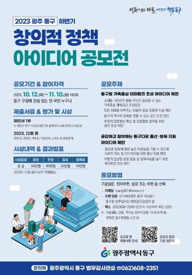 [¹Ìµð¾îÀü³² ±èÁ¤¿ì ±âÀÚ]±¤ÁÖ µ¿±¸´Â ¿À´Â 11¿ù 10ÀϱîÁö ¡®2023 âÀÇÀû Á¤Ã¥ ¾ÆÀ̵ð¾î °ø¸ðÀü¡¯À» ½Ç½ÃÇÑ´Ù°í ¹àÇû´Ù. À̹ø °ø¸ðÀüÀº ÁֹΠ½º½º·Î ±¸¹ÎÀÇ Çູ ÁõÁø°ú Áö¿ª ¹ßÀü ¹æÇâÀ» ¸ð»öÇØ Âü½ÅÇÑ ¾ÆÀ̵ð¾î¿Í ½Ç¿ëÀûÀÎ ½ÃÃ¥À» ¹ß±¼¡¦