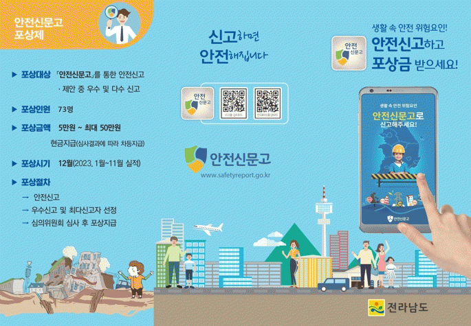 [¹Ìµð¾îÀü³² Á¦°¥´ëÁ¾ ±âÀÚ]Àü¶ó³²µµ´Â ÀÏ»ó»ýȰ ¼Ó¿¡¼ ¹ß°ßÇÑ ¾ÈÀüÀ§Çè ¿äÀÎÀ» ½Å°íÇØ »ç°í¿Í Àç³ ¿¹¹æ¿¡ ±â¿©ÇÑ µµ¹Î 73¸íÀ» ¼±Á¤, ¡®¾ÈÀü½Å°í Æ÷»ó±Ý¡¯ ÃÑ 1õ¸¸ ¿øÀ» Áö±ÞÇÒ °èȹÀ̶ó°í ¹àÇû´Ù. ¾ÈÀü½Å°í ´ë»óÀº »ýȰ¾ÈÀü, ±³Åë¾È¡¦
