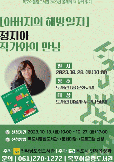 [¹Ìµð¾îÀü³² °í±Ô¼® ±âÀÚ]¸ñÆ÷¾î¿ï¸²µµ¼°üÀÌ 2023³â Àü¶ó³²µµ ¿ÃÇØÀÇ Ã¥À¸·Î ¼±Á¤µÈ ¡°¾Æ¹öÁöÀÇ ÇØ¹æÀÏÁö¡±ÀÇ ÀúÀÚ Á¤Áö¾Æ ÀÛ°¡¿ÍÀÇ ¸¸³²À» ½Ã¹Î 50¿©¸íÀ» ´ë»óÀ¸·Î ÁøÇàÇÑ´Ù. Á¤Áö¾Æ ÀÛ°¡´Â 1990³â ÀåÆí¼Ò¼³ ¡°»¡Ä¡»êÀÇ µþ¡±À» Æì³»¸ç¡¦