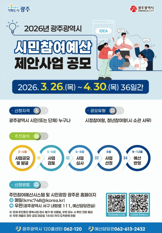 [¹Ìµð¾îÀü³² Á¦°¥´ëÁ¾ ±âÀÚ] ±¤ÁÖ±¤¿ª½Ã´Â 2027³âµµ ¿¹»ê °úÁ¤¿¡ ½Ã¹ÎÂü¿©¸¦ º¸ÀåÇϱâ À§ÇÑ ¡®½Ã¹ÎÂü¿©¿¹»ê Á¦¾È»ç¾÷¡¯À» 4¿ù30ÀϱîÁö Á¢¼öÇÑ´Ù. ½Ã¹ÎÂü¿©¿¹»êÀº ÀçÁ¤ ¿î¿µÀÇ Åõ¸í¼ºÀ» ³ôÀ̰í, ÀçÁ¤¹ÎÁÖÁÖÀǸ¦ °ÈÇØ ½Ã¹Î »îÀÇ ÁúÀ» Ç⡦