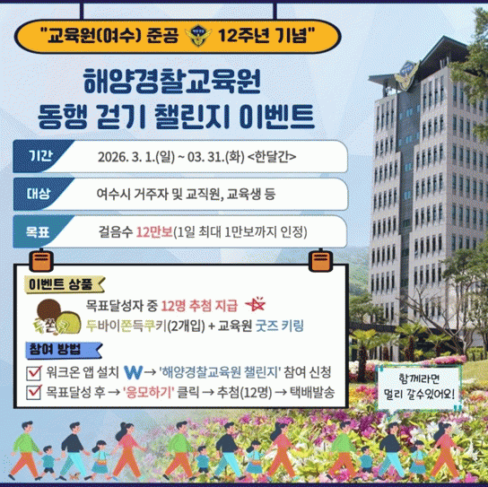 [¹Ìµð¾îÀü³² Á¦°¥´ëÁ¾ ±âÀÚ]ÇØ¾ç°æÂû±³À°¿øÀº ±³À°¿ø ¿©¼ö Áذø 12ÁÖ³âÀ» ±â³äÇØ ¿À´Â 3¿ù 1ÀϺÎÅÍ 31ÀϱîÁö ÇÑ ´Þ°£, ¿©¼ö ½Ã¹Î°ú ÇÔ²²ÇÏ´Â ºñ´ë¸é °È±â Çà»ç 'ÇØ¾ç°æÂû±³À°¿ø µ¿Çà °È±â 縰Áö'¸¦ ¿î¿µÇÑ´Ù. À̹ø 縰Áö´Â GPS ±â¹Ý¡¦