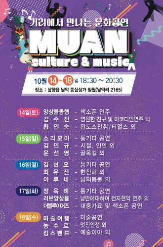 [¹Ìµð¾îÀü³² ±èÆÇ±¹ ±âÀÚ]Àü³² ¹«¾È±ºÀº ¿À´Â 14ÀϺÎÅÍ 18ÀϱîÁö 5Àϰ£ ³²¾Ç Áß½É»ó°¡ ÀÏ¿ø(³²¾Ç¸® 2165)¿¡¼ ¡®°Å¸®¿¡¼ ¸¸³ª´Â ¹®È°ø¿¬¡¯À» ½ÃÇàÇÑ´Ù. ³²¾Ç Áß½É»ó°¡ ÀÏ¿ø¿¡ ÀÖ´Â ³²¾Ç½Åµµ½Ã ¸íǰ°Å¸® Á¶Çü¹° ¾Õ¿¡¼ ´ëÁß°¡¿ä, ±âŸ ¹×¡¦