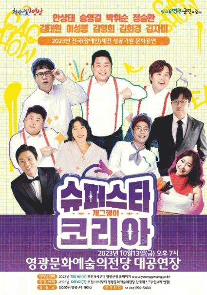 [¹Ìµð¾îÀü³² Á¦°¥´ëÁ¾ ±âÀÚ]- 2023³â Àü±¹(Àå¾ÖÀÎ)üÀü ¼º°ø±â¿ø ¹®È°ø¿¬ - ¿µ±¤±ºÀº ¿À´Â 10¿ù 13ÀÏ ¿ÀÈÄ 7½Ã ¿µ±¤¹®È¿¹¼úÀÇÀü´ç ´ë°ø¿¬Àå¿¡¼ 2023³â Àü±¹(Àå¾ÖÀÎ)üÀü ¼º°ø±â¿ø ¹®È°ø¿¬À¸·Î¡®°³±×¼î-°³±×ÀïÀÌ ½´ÆÛ½ºÅ¸ ÄÚ¸®¾Æ¡¯¸¦¡¦