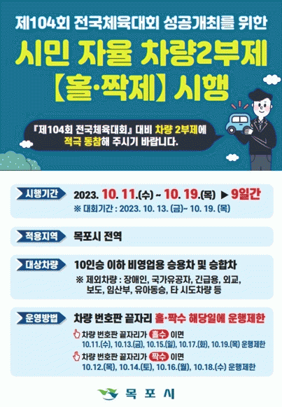 [¹Ìµð¾îÀü³² °í±Ô¼® ±âÀÚ]¸ñÆ÷½Ã°¡ Àü±¹Ã¼ÀüÀÇ ¼º°ø Áö¿øÀ» À§ÇØ ¿À´Â 11ÀϺÎÅÍ 19ÀϱîÁö ½Ã¹Î ÀÚÀ²Âü¿© Â÷·® 2ºÎÁ¦¸¦ ½ÃÇàÇÑ´Ù. Â÷·® 2ºÎÁ¦´Â Àü±¹Ã¼Àü ±â°£µ¿¾È ¿øÈ°ÇÑ Â÷·® ¼ÒÅëÀ» Áö¿øÇϱâ À§ÇØ Â÷·® ³¡¹øÈ£°¡ Ȧ¼öÀÎ Â÷·®Àº Ȧ¼öÀÏ¡¦