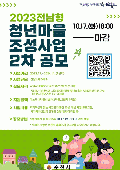 [¹Ìµð¾îÀü³² ÀÓ¼º¿Ï ±âÀÚ]¼øÃµ½Ã´Â Àü¶ó³²µµ¿¡¼ ÁÖ°üÇϴ¡®2023³â Àü³²Çü û³â¸¶À» Á¶¼º»ç¾÷¡¯¿¡ Âü¿©ÇÒ Ã»³â´Üü¡¤±â¾÷À» ¿À´Â 17ÀϱîÁö °ø°³ ¸ðÁýÇÑ´Ù°í ¹àÇû´Ù. À̹ø °ø¸ð»ç¾÷Àº »ó¹Ý±â¿¡ À̾î 5°³ ¸¶À»À» Ãß°¡·Î °ø¸ðÇØ û³âµéÀÌ Áö¡¦