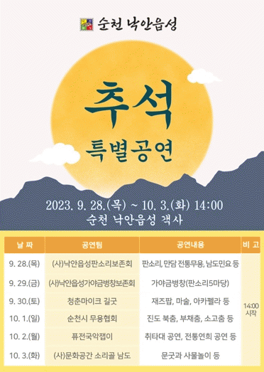 [¹Ìµð¾îÀü³² ÀÓ¼º¿Ï ±âÀÚ]¼øÃµ½Ã´Â ¼øÃµ ³«¾ÈÀ¾¼º¿¡¼ ¿À´Â 28ÀϺÎÅÍ ´ÙÀ½ ´Þ 3ÀϱîÁö ¼øÃµ ³«¾ÈÀ¾¼º °´»ç¿¡¼ Ãß¼® Ưº° °ø¿¬À» ¿ÀÈÄ 2½Ã¿¡ ¿î¿µÇÑ´Ù. ±¹¾Ç, ÆÇ¼Ò¸®, ÀüÅ빫¿ë, »ç¹°³îÀÌ µî ´Ù¾çÇÑ ÀüÅë °ø¿¬À» ÁغñÇßÀ¸¸ç 30ÀÏ¿¡´Â û¡¦