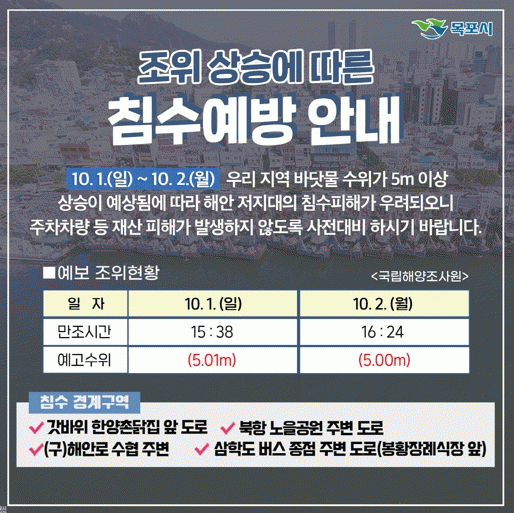 [¹Ìµð¾îÀü³² °í±Ô¼® ±âÀÚ]¸ñÆ÷½Ã´Â ´ëÁ¶±âÀÎ 10¿ù 1ÀÏ, 10¿ù 2ÀÏ (¿ÀÈÄ 2½Ã ~ 7½Ã) »çÀÌ ¹Ù´å¹° ¼öÀ§°¡ 5.0m ÀÌ»ó (Á¶¼®Ç¥»ó 10/1 ÃÖ°í 5.01m) »ó½Â ¿¹»óµÊ¿¡ µû¶ó ÇÇÇØ¸¦ ÀÔÁö ¾Êµµ·Ï öÀúÇÑ ´ëºñ¸¦ ´çºÎÇß´Ù. ¸ñÆ÷½Ã´Â ºñ»ó±Ù¹«¹ÝÀ» Æí¡¦
