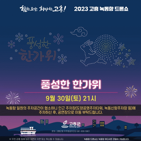 [¹Ìµð¾îÀü³² Á¦°¥´ëÁ¾ ±âÀÚ]°íÈﱺÀÌ Àü³² ÃÖÃÊ·Î ¸ÅÁÖ Åä¿äÀϸ¶´Ù »ó¼³ °ø¿¬À¸·Î ÁøÇàÁßÀÎ ¡®2023 °íÈï ³ìµ¿Ç× µå·Ð¼î¡¯ °ø¿¬ÀÌ ¿À´Â Ãß¼® ¸íÀýÀ» ¸ÂÀÌÇØ ´õ Ưº°ÇÑ °ø¿¬À» ÆîÄ¥ ¿¹Á¤ÀÌ´Ù. ¿À´Â 9¿ù 30ÀÏ Àú³á 9½Ã¿¡ 500´ëÀÇ µå·ÐÀ¸·Î ¡¦