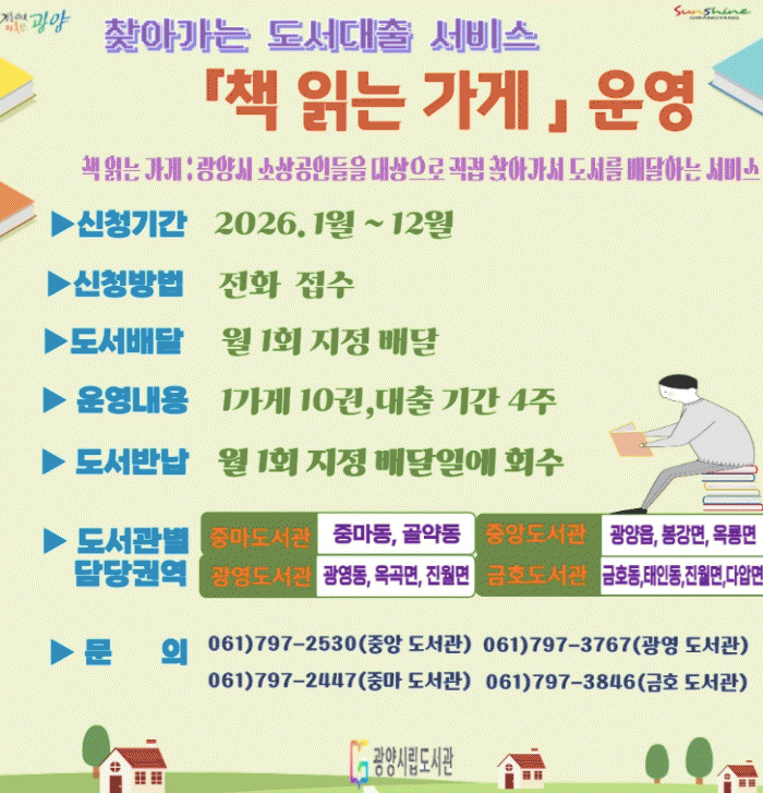 [¹Ìµð¾îÀü³² ÀÓ¼º¿Ï ±âÀÚ]±¤¾ç½Ã¸³µµ¼°üÀº Áö¿ª»çȸ µ¶¼¹®È È®»êÀ» À§ÇØ µµ¼°ü ¹æ¹®ÀÌ ¾î·Á¿î Áö¿ª ³» ¼Ò»ó°øÀÎÀ» ´ë»óÀ¸·Î 2026³â ¡®Ã¥ Àд °¡°Ô¡¯ »ç¾÷À» ¿î¿µÇÑ´Ù. ¡®Ã¥ Àд °¡°Ô¡¯´Â Áö¿ª ³» Ä«Æä¡¤¼Á¡¡¤¹Ì¿ë½Ç µî 2ÀÎ ÀÌÇÏ ¡¦