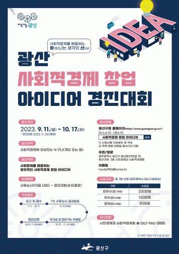 [¹Ìµð¾îÀü³² ±èÁ¤¿ì ±âÀÚ]±¤ÁÖ ±¤»ê±¸°¡ ¡®±¤»ê »çȸÀû°æÁ¦ â¾÷ ¾ÆÀ̵ð¾î °æÁø´ëȸ¡¯ Âü°¡ÀÚ¸¦ ¸ðÁýÇÑ´Ù. À̹ø °æÁø´ëȸ´Â »çȸÀû °¡Ä¡¿¡ ÁÖ¸ñÇÑ Ã¢ÀÇÀûÀÎ »ý°¢À¸·Î »çȸ ¹®Á¦¸¦ ÇØ°áÇÏ´Â »çȸÀû°æÁ¦ ±â¾÷°¡ ¹ß±¼ ¹× À°¼ºÀ» ¸ñÀûÀ¸·Î ÇÑ¡¦
