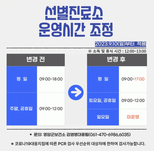 [¹Ìµð¾îÀü³² Á¦°¥´ëÁ¾ ±âÀÚ]¿µ¾Ï±ºÀÌ Äڷγª19ÀÇ 4±Þ °¨¿°º´ Àüȯ¿¡ µû¶ó º¸°Ç¼Ò ¼±º°Áø·á¼Ò ¿î¿µ½Ã°£À» 10ÀϺÎÅÍ ´ÜÃà Á¶Á¤ÇÑ´Ù. ÆòÀÏÀº ¿ÀÀü9~¿ÀÈÄ5½Ã, Åä¿äÀÏ ¹× °øÈÞÀÏÀº ¿ÀÀü9~Á¤¿À12½Ã ¿î¿µÇϰí, ÀÏ¿äÀÏÀº ¹®À» ¿Áö ¾Ê´Â´Ù. ¼±¡¦