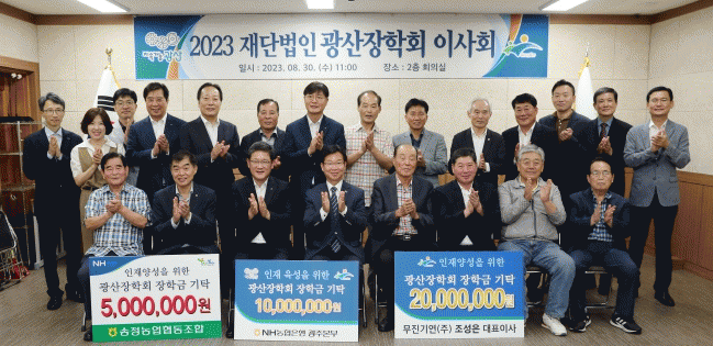 [¹Ìµð¾îÀü³² ±èÁ¤¿ì ±âÀÚ]Àç´Ü¹ýÀÎ ±¤»êÀåÇÐȸ°¡ 30ÀÏ ¿ÀÀü ±¤»ê±¸Ã» 2Ãþ »óȲ½Ç¿¡¼ 2023³â Á¦2Â÷ ÀÌ»çȸ¸¦ °³ÃÖÇÑ °¡¿îµ¥, ȸÀÇ¿¡ ¾Õ¼ Áö¿ª ÀÎÀç À°¼ºÀ» À§ÇÑ ÀåÇÐ±Ý Àü´Þ½ÄÀÌ ¿·È´Ù. Àü´Þ½Ä¿¡¼ NH³óÇùÀºÇà ±¤ÁÖº»ºÎ´Â 1000¸¸ ¿ø, ¹«¡¦