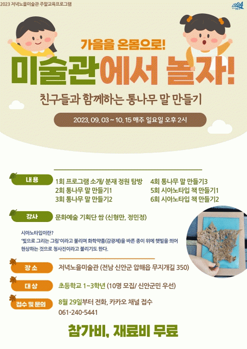 [¹Ìµð¾îÀü³² °í±Ô¼® ±âÀÚ]½Å¾È±º Àú³á³ëÀ»¹Ì¼ú°ü¿¡¼´Â 2023³âµµ ÇϹݱâ ÁÖ¸» ±³À°ÇÁ·Î±×·¥ ¡®°¡À»À» ¿Â¸öÀ¸·Î! ¹Ì¼ú°ü¿¡¼ ³îÀÚ!¡¯ Âü¿©ÀÚ¸¦ ¸ðÁýÇÑ´Ù. º» ÇÁ·Î±×·¥Àº ¿À´Â 9¿ù 3ÀϺÎÅÍ 10¿ù 15ÀϱîÁö ÃÑ 6ȸÂ÷ ÇÁ·Î±×·¥À¸·Î ¸ÅÁÖ ÀϿ䡦