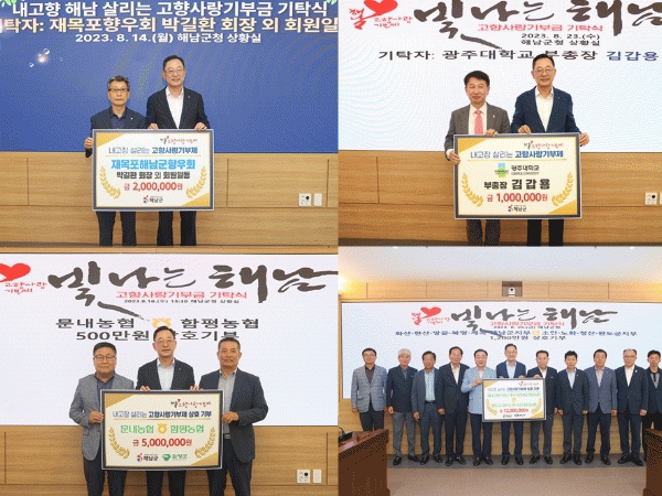 [¹Ìµð¾îÀü³² Á¦°¥´ëÁ¾ ±âÀÚ]ÇØ³²±º Ãâ½Å Çâ¿ìµé°ú ÇØ³²À» ÀÀ¿øÇÏ´Â Àü ±¹¹ÎÀÇ °íÇâ»ç¶û ±âºÎ°¡ ¿¬ÀÏ À̾îÁö°í ÀÖ´Ù. Áö³ 8¿ù 14ÀÏ Àç¸ñÆ÷ÇØ³²Çâ¿ìȸ¿¡¼ °íÇâ»ç¶û±âºÎ±Ý 200¸¸¿øÀ» ±âŹÇß´Ù. À̹ø ±âºÎ´Â Áö³ 4¿ù 1,210¸¸¿ø¿¡ ÀÌ¾î µÎ¡¦