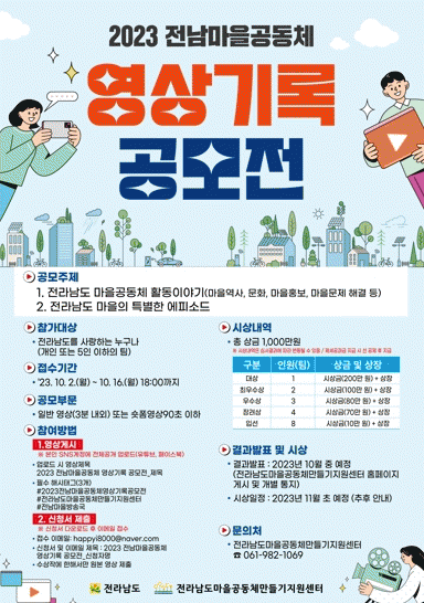 [¹Ìµð¾îÀü³² Á¦°¥´ëÁ¾ ±âÀÚ]Àü¶ó³²µµ´Â µµ³» ¸¶À» È«º¸¿Í Áֹΰøµ¿Ã¼ Ȱ¼ºÈ¸¦ À§ÇØ ¡®2023 Àü³²¸¶À»°øµ¿Ã¼ ¿µ»ó±â·Ï °ø¸ðÀü¡¯À» °³ÃÖÇÑ´Ù. Àü³²µµ°¡ ÁÖÃÖÇϰí Àü³²¸¶À»°øµ¿Ã¼¸¸µé±âÁö¿ø¼¾ÅÍ¿¡¼ ÁÖ°üÇÏ´Â À̹ø °ø¸ðÀüÀº ¸¶À»°øµ¿Ã¼ Ȱµ¿¡¦