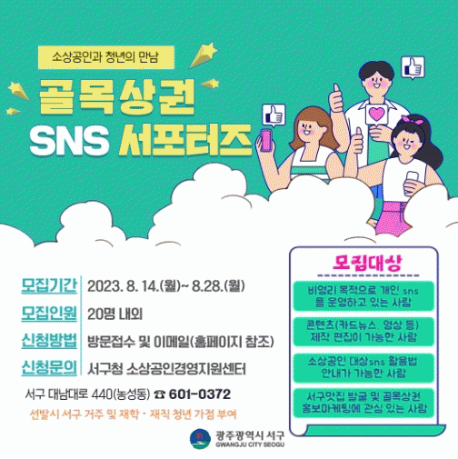[¹Ìµð¾îÀü³² ±èÁ¤¿ì ±âÀÚ]±¤ÁÖ±¤¿ª½Ã ¼±¸°¡ Áö¿ª ¼Ò»ó°øÀεéÀ» Áö¿øÇϱâ À§ÇØ ¡®°ñ¸ñ»ó±Ç SNS¼Æ÷ÅÍÁ¸¦ ¿î¿µÇÑ´Ù. ¼±¸´Â ¿À´Â 28ÀϱîÁö ´ëÇлý ¹× û³â 20¸íÀ» ¸ðÁý, À̵éÀ» ¡®Á¦1±â °ñ¸ñ»ó±Ç SNS¼Æ÷ÅÍÁ·Î ÀÓ¸íÇØ ¼±¸ °ü³»¡¦
