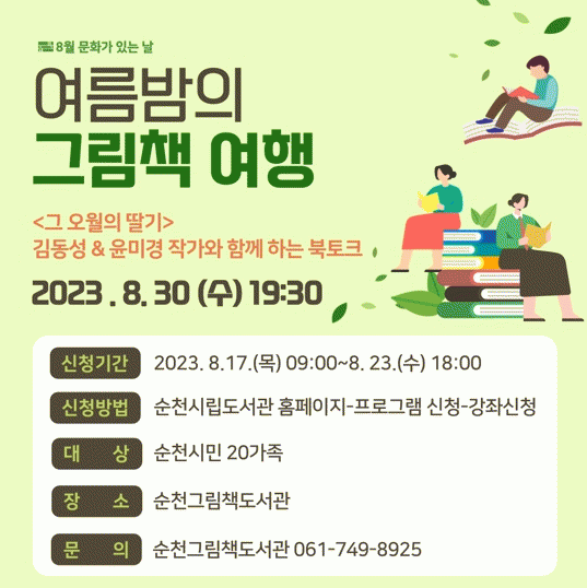 [¹Ìµð¾îÀü³² ÀÓ¼º¿Ï ±âÀÚ]¼øÃµ½Ã´Â ¡®¹®È°¡ ÀÖ´Â ³¯(¸Å¿ù ¸¶Áö¸· ÁÖ ¼ö¿äÀÏ)¡¯À» ¸ÂÀÌÇÏ¿© ¿À´Â 30ÀÏ Àú³á 7½Ã 30ºÐ¿¡ ¼øÃµ±×¸²Ã¥µµ¼°ü¿¡¼ À½¾Ç°ú ÇÔ²² ±×¸²Ã¥ ÀÛ°¡¿Í ¼ÒÅëÇϰí À̾߱⸦ ³ª´©´Â ¡®¿©¸§¹ãÀÇ ±×¸²Ã¥¿©Ç࡯À» ¿î¿µÇÑ´Ù. ¡¦