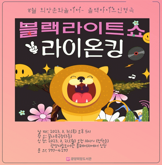 [¹Ìµð¾îÀü³² ÀÓ¼º¿Ï ±âÀÚ]±¤¾çÈñ¸Áµµ¼°üÀÌ 8¿ù Èñ¸Á¹®È³îÀÌÅÍ Çà»ç·Î ¿À´Â 31ÀÏ ¿ÀÈÄ 5½Ã ²Þ³ª¹«±ØÀå¿¡¼ ¾î¸°ÀÌ¿Í °¡Á· 130¸íÀ» ÃÊ´ëÇØ ¡®ºí·¢¶óÀÌÆ®¼î¡¯¸¦ ¿î¿µÇÑ´Ù°í ¹àÇû´Ù. Èñ¸Á¹®È³îÀÌÅÍ´Â ¸Å´Þ ¸¶Áö¸· ¼ö¿äÀÏ ¡®¹®È°¡ ÀÖ´Â ³¯¡¦