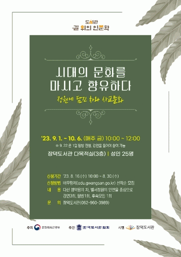 [¹Ìµð¾îÀü³² ±èÁ¤¿ì ±âÀÚ]±¤ÁÖ ±¤»ê±¸ Àå´öµµ¼°üÀÌ ¡®±æ À§ÀÇ Àι®ÇС¯À¸·Î ¿©´Â ¡®Á¤¿ø¿¡ ´ã±ä Â÷¿Í »ç±³ ¹®È¡¯ Àι®ÇÐ °¿¬ Âü¿©ÀÚ¸¦ ¸ðÁýÇÑ´Ù. ¡®±æ À§ÀÇ Àι®ÇС¯Àº ¹®ÈüÀ°°ü±¤ºÎ°¡ ÁÖÃÖÇϰí Çѱ¹µµ¼°üÇùȸ°¡ ÁÖ°üÇÏ´Â °ø¸ð»ç¾÷¡¦