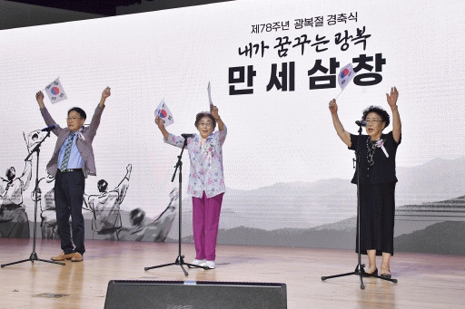[¹Ìµð¾îÀü³² Á¦°¥´ëÁ¾ ±âÀÚ]¡°´ëÇѵ¶¸³¸¸¼¼!¡± Á¦78Áֳ⠱¤º¹ÀýÀ» ¸ÂÀº 15ÀÏ ¿ÀÀü 10½Ã50ºÐ. °æÃà½ÄÀÌ ¿¸° ±¤ÁÖ±¤¿ª½Ãû ´ëȸÀÇ½Ç °¡µæ ¸¸¼¼»ïâÀÌ ¿ï·ÁÆÛÁ³´Ù. À̹ø ¸¸¼¼»ïâÀÇ ¼±µÎ¿¡´Â ÃÖ¸¸³â ¾Ö±¹Áö»ç ¼ÕÀÚ³àÀÎ ÃÖÀåÈÆ ¼±»ý, ÀÏÁ¦°¡¦