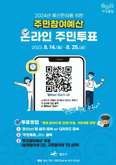 [¹Ìµð¾îÀü³² ±èÁ¤¿ì ±âÀÚ]±¤ÁÖ ±¤»ê±¸°¡ 2024³â ÁÖ¹ÎÂü¿©¿¹»ê»ç¾÷ ¼±Á¤À» À§ÇÑ ¡®¿Â¶óÀÎ ÁÖ¹ÎÅõÇ¥¡¯¸¦ ½Ç½ÃÇÑ´Ù. ³»³â ±¤»ê±¸ ÁÖ¹ÎÂü¿©¿¹»êÀº ¿ÃÇØº¸´Ù 1¾ï ¿ø ´Ã¾î³ 12¾ï ¿ø ±Ô¸ð´Ù. ¡âÀϹÝÂü¿©Çü ¡â±¸Á¤Âü¿©Çü ¡âû³âÂü¿©Çü ¡âÀÚÄ¡°è¡¦