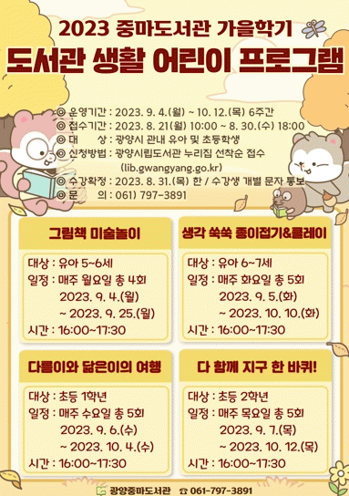 [¹Ìµð¾îÀü³² ÀÓ¼º¿Ï ±âÀÚ]Á߸¶µµ¼°üÀº °¡À»Çб⸦ ¸Â¾Æ ¿À´Â 9¿ù 4ÀϺÎÅÍ 10¿ù 12ÀϱîÁö 6ÁÖ µ¿¾È ¾î¸°ÀÌ(À¯¾Æ 5~7¼¼)¿Í ÃʵîÇлý(1~2Çгâ)À» ´ë»óÀ¸·Î µµ¼°ü »ýȰ ¾î¸°ÀÌ ÇÁ·Î±×·¥¿¡ Âü¿©ÇÒ ¼ö°»ýÀ» ¸ðÁýÇÑ´Ù. °³¼³µÇ´Â ÇÁ·Î±×·¥Àº ¡¦