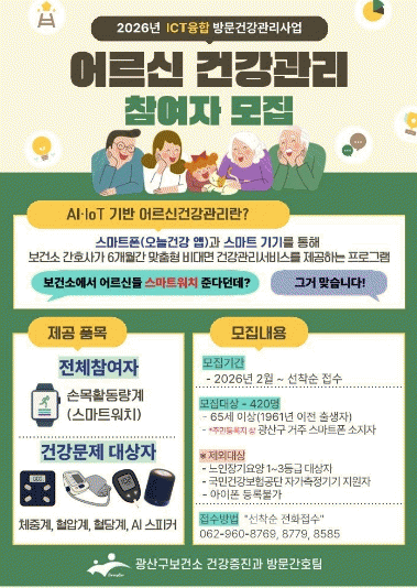 [¹Ìµð¾îÀü³² Á¦°¥´ëÁ¾ ±âÀÚ]±¤ÁÖ ±¤»ê±¸°¡ 65¼¼ ÀÌ»ó ¾î¸£½ÅÀ» ´ë»óÀ¸·Î ÀΰøÁö´É(AI)¡¤»ç¹°ÀÎÅͳÝ(IoT) ±â¹Ý ¾î¸£½Å °Ç°°ü¸® »ç¾÷ ½Å±Ô Âü¿©ÀÚ 420¸íÀ» ¼±Âø¼ø ¸ðÁýÇÑ´Ù. ¾î¸£½Å °Ç°°ü¸® »ç¾÷Àº ½º¸¶Æ®Æù ¾Û(¿À´Ã°Ç°)°ú ½º¸¶Æ® ±â±â¡¦