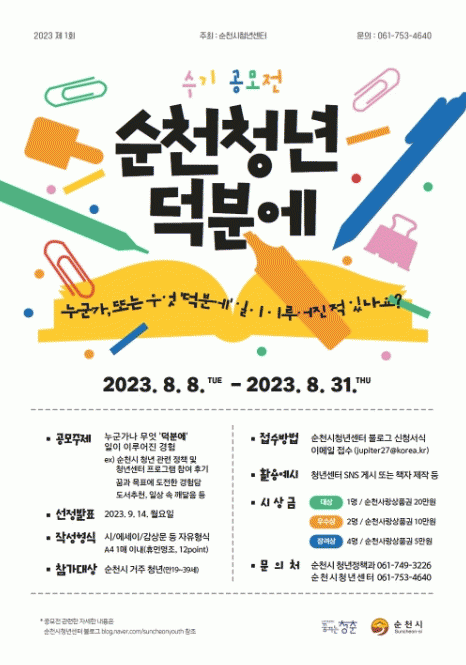 [¹Ìµð¾îÀü³² ÀÓ¼º¿Ï ±âÀÚ]¼øÃµ½Ã´Â ÀÌ´Þ 8ÀϺÎÅÍ 31ÀϱîÁö ¡®¼øÃµÃ»³â ´öºÐ¿¡¡¯¼ö±â °ø¸ðÀüÀ» °³ÃÖÇÑ´Ù°í ¹àÇû´Ù. À̹ø °ø¸ð´Â ¼øÃµ½Ã û³âµéÀÌ ´©±º°¡³ª ¹«¾ð°¡¡®´öºÐ¿¡¡¯ Áñ°Ì°í ÇູÇß´ø °¢ÀÚÀÇ °æÇèÀ» °øÀ¯ÇÔÀ¸·Î½á ¼·Î¿¡°Ô °ø°¨ÇÏ¡¦