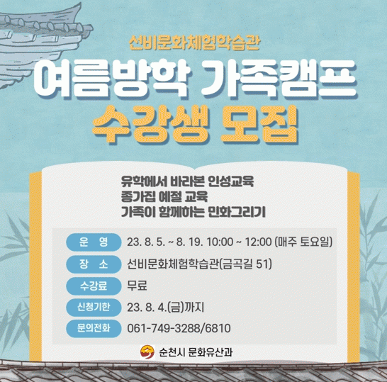 [¹Ìµð¾îÀü³² ÀÓ¼º¿Ï ±âÀÚ]¼øÃµ½Ã´Â ¿©¸§¹æÇÐÀ» ¸Â¾Æ ¿À´Â 5ÀϺÎÅÍ 19ÀϱîÁö 3ÁÖ µ¿¾È ¸ÅÁÖ Åä¿äÀÏ ¼±ºñ¹®ÈüÇèÇнÀ°ü¿¡¼¡®¿©¸§¹æÇÐ °¡Á·Ä·ÇÁ¡¯ÇÁ·Î±×·¥À» ¿î¿µÇÑ´Ù°í ¹àÇû´Ù. À̹ø ¿©¸§¹æÇÐ °¡Á·Ä·ÇÁ´Â¡®Ã»¼Ò³â Àμº±³À°¡¯ÀÇ ¿¬Àå¼±À¸¡¦
