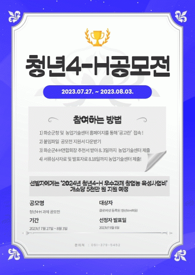 [¹Ìµð¾îÀü³² Á¦°¥´ëÁ¾ ±âÀÚ]ȼø±ºÀº '2024³âµµ û³â 4-H ¿ì¼ö°úÁ¦ â¾÷³ó À°¼º»ç¾÷' °ø¸ðÀü ´ë»óÀÚ¸¦ ¸ðÁýÇÑ´Ù. À̹ø °ø¸ðÀüÀº ±Þº¯ÇÏ´Â ³ó¾÷ȯ°æ¿¡ ÀûÀÀÇÒ ¼ö ÀÖµµ·Ï ÷´Ü À¶º¹ÇÕ ±â¼ú³ó¾÷°ú ÀÚÀ²ÀûÀ̰í âÀÇÀûÀÎ °úÁ¦ Ȱµ¿ Áö¿øÀ» À§¡¦