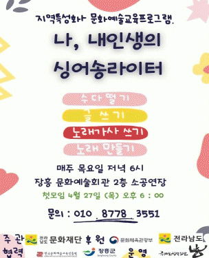 [¹Ìµð¾îÀü³² Á¦°¥´ëÁ¾ ±âÀÚ]ÀåÈﱺ¿¡¼ Ȱµ¿Çϰí ÀÖ´Â ±Ø´Ü ¡®±Ø¿¹¼úâÀÛÁý´Ü ÈÀº ¹®È¿¹¼ú±³À°ÇÁ·Î±×·¥(³ª, ³» ÀλýÀÇ ½Ì¾î¼Û¶óÀÌÅÍ)À» ÁøÇàÇÑ´Ù. À̹ø ÇÁ·Îµå·¥Àº ¡®Áö¿ªÆ¯¼ºÈ ¹®È¿¹¼ú±³À° Áö¿ø»ç¾÷¡¯À¸·Î ÀåÈïÀÇ ½ÅÁ߳⼼´ë(50~¡¦