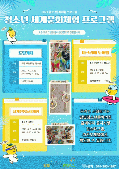 [¹Ìµð¾îÀü³² Á¦°¥´ëÁ¾ ±âÀÚ]´ã¾ç±º ´ãºûû¼Ò³â¹®ÈÀÇÁýÀº ¿©¸§¹æÇÐÀ» ¸ÂÀÌÇÏ¿© û¼Ò³âµéÀ» À§ÇÑ ¼¼°è °¢±¹ÀÇ ¹®È¸¦ üÇèÇÒ ¼ö ÀÖ´Â ¡®Ã»¼Ò³â ¼¼°è¹®ÈüÇè ÇÁ·Î±×·¥¡¯À» ¿î¿µÇÑ´Ù. À̹ø ÇÁ·Î±×·¥Àº ¿À´Ã 7¿ù 22ÀϺÎÅÍ 8¿ù 4ÀϱîÁö ÃÑ 4¡¦