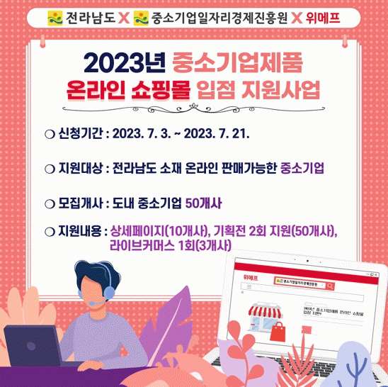[¹Ìµð¾îÀü³² Á¦°¥´ëÁ¾ ±âÀÚ]Àü¶ó³²µµ´Â Áß¼Ò±â¾÷ ÆÇ·Î Áö¿øÀ» ÅëÇÑ Áö¿ª°æÁ¦ Ȱ¼ºÈ¸¦ À§ÇØ ¡®2023 ¿Â¶óÀÎ ¼îÇθô ÀÔÁ¡ Áö¿ø»ç¾÷¡¯ Âü°¡ ±â¾÷À» ¸ðÁýÇÑ´Ù°í ¹àÇû´Ù. ¿Â¶óÀÎ ÆÇ¸Å °¡´ÉÇÑ Àü³²Áö¿ª Áß¼Ò±â¾÷ 50°³ »ç¸¦ ¼±Á¤ÇØ ¢ßÀ§¸ÞÇÁ ÀÔ¡¦