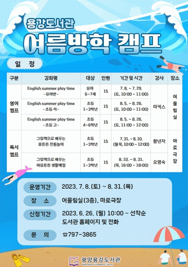 [¹Ìµð¾îÀü³² ÀÓ¼º¿Ï ±âÀÚ]±¤¾ç¿ë°µµ¼°üÀº ¿©¸§¹æÇÐÀ» ¸ÂÀÌÇÏ¿© ¿À´Â 7¿ù 8ÀϺÎÅÍ 8¿ù 31ÀϱîÁö 8ÁÖ µ¿¾È À¯¾Æ¿Í ¾î¸°À̸¦ ´ë»óÀ¸·Î ¿©¸§¹æÇÐ Ä·ÇÁ¸¦ ¿î¿µÇÑ´Ù. À̹ø ÇÁ·Î±×·¥Àº ¿¬·Éº° 5°³ °Á·Π³ª´² ¿µ¾îÄ·ÇÁ¿Í µ¶¼Ä·ÇÁ¸¦ ¿î¿µÇϸ硦
