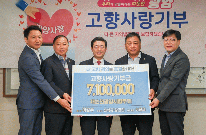 [¹Ìµð¾îÀü³² ÀÓ¼º¿Ï ±âÀÚ]±¤¾ç½Ã´Â 29ÀÏ Àç¼øÃµ±¤¾ç½ÃÇâ¿ìȸ ȸÀå´Ü 4¸íÀÌ ³» °íÇâ ±¤¾çÀÇ ¹Ì·¡¿Í ¹ßÀüÀ» ÀÀ¿øÇÏ¸ç °íÇâ»ç¶û±âºÎ±Ý 710¸¸¿øÀ» ±âŹÇß´Ù°í ¹àÇû´Ù. À̹ø ±âºÎ¿¡´Â ¿ÃÇØ ÃëÀÓÇÑ À̰©ÁÖ È¸ÀåÀ» ºñ·ÔÇÑ È¸Àå´Ü 4¸íÀÌ µ¿ÂüÇßÀ¸¡¦