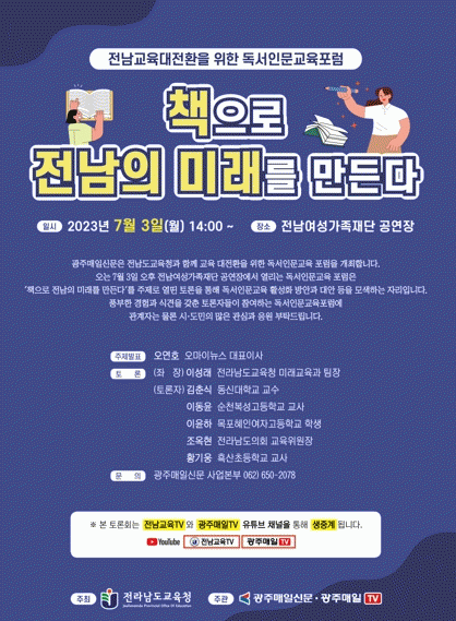 [¹Ìµð¾îÀü³² Á¦°¥´ëÁ¾ ±âÀÚ]ÁÖ¹ÎÁ÷¼± 4±â Àü³²±³À°ÀÇ ÇÙ½É Á¤Ã¥ÀÎ ¡®Ã¥ Àд Àü³²±³À°¡¯ÀÇ ¹ßÀü¹æ¾ÈÀ» ¸ð»öÇÏ´Â ³íÀÇÀÇ ÀåÀÌ ÆîÃÄÁø´Ù. Àü¶ó³²µµ±³À°Ã»Àº ¿À´Â 7¿ù 3ÀÏ ¿ÀÈÄ 2½Ã Àü³²¿©¼º°¡Á·Àç´Ü °ø¿¬Àå¿¡¼ ¡®Ã¥À¸·Î Àü³²ÀÇ ¹Ì·¡¸¦ ¸¸¡¦